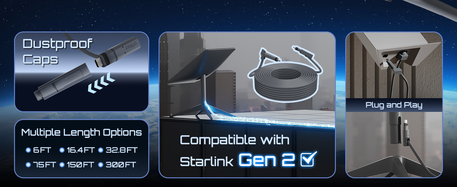 - Reliable Backup Starlink Cable Option: STARGEAR Starlink cable provides 6ft/32.8ft/75ft/150ft/300ft options, meet your versatile installed scenes or as a backup replacement or extension power cable cord. No need to cut or modify your original cable.
