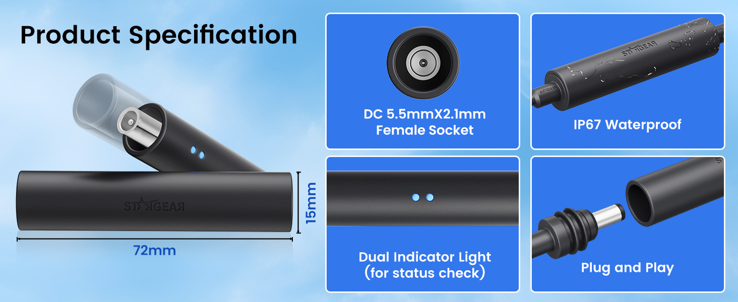 - Dual Blue LED Indicators for Instant Connection Status: Ensure setup success at a glance! STARGEAR starlink cable coupler features Dual Blue LED Power Indicatorsthat instantly glow blue upon a proper power connection. This dual-light system provides double the confirmation, delivering clear visual assurance that both sides of your starlink mini power cord are correctly energized and securely connected for total peace of mind.