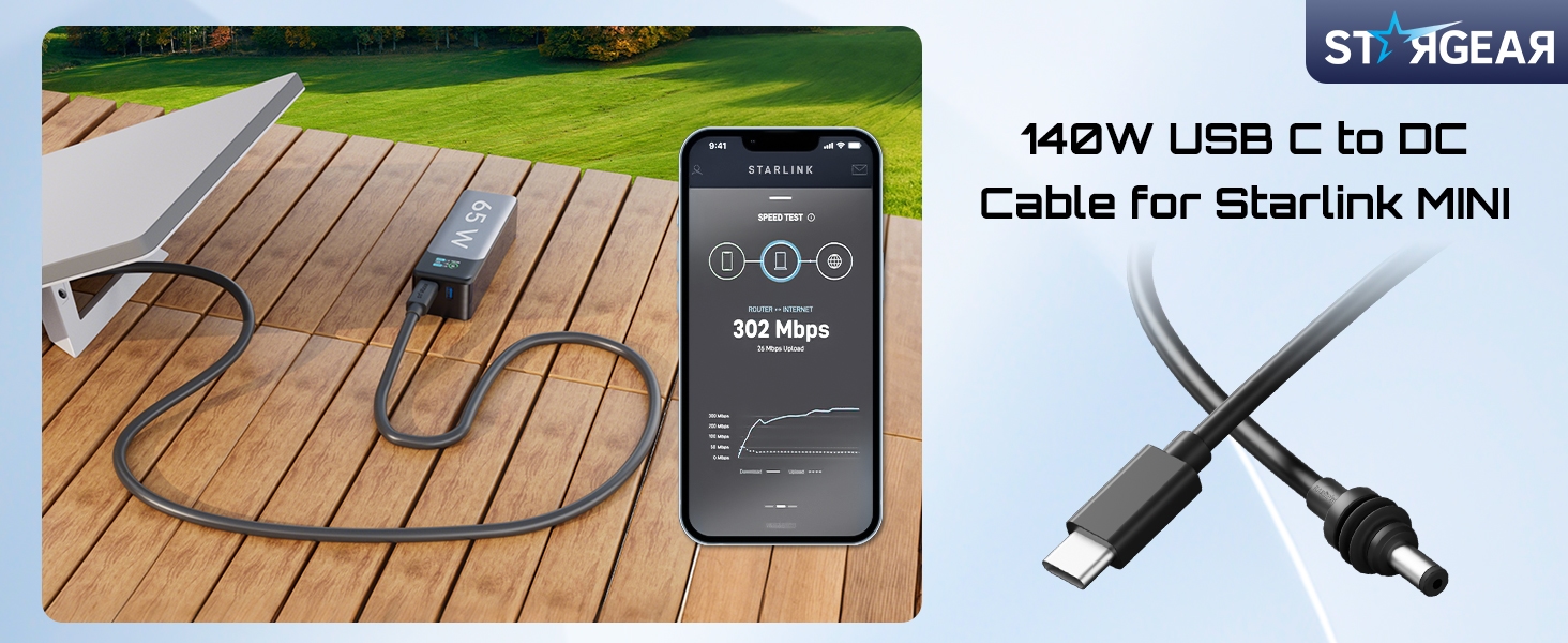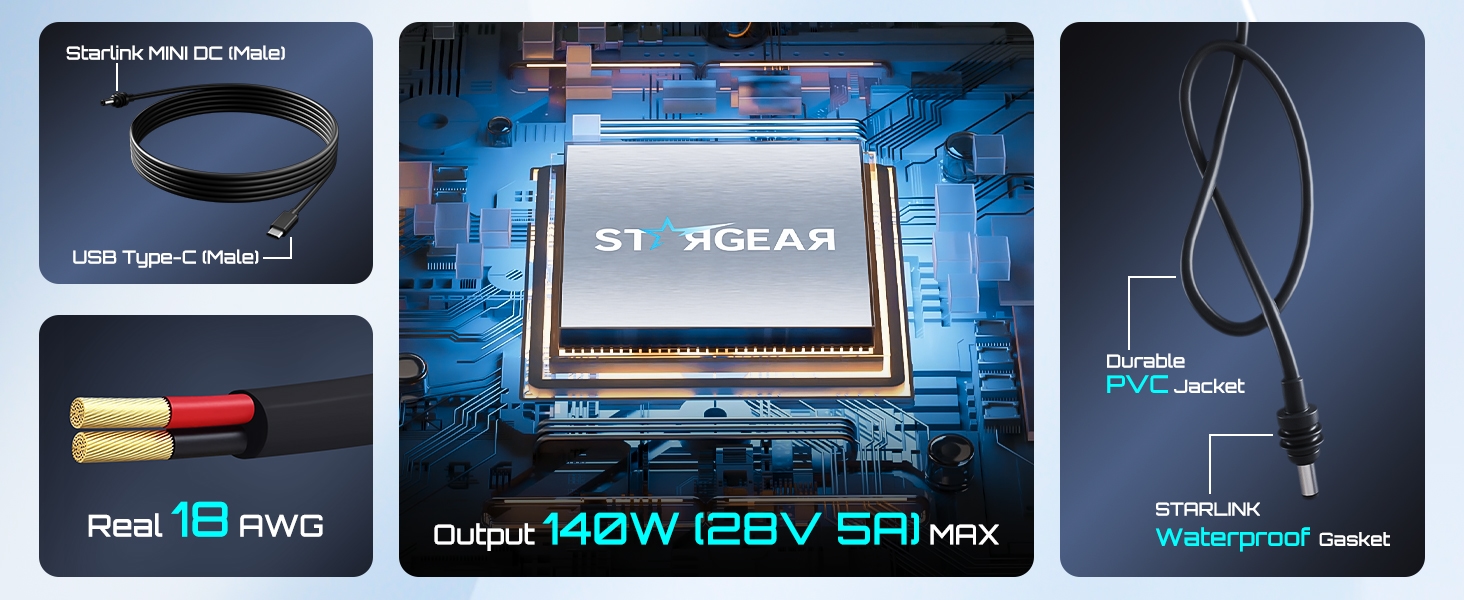 • Powerful Protocol Chip: STARGEAR Starlink mini cable intergrated with customized smart protocol chip compatible with 28V PPS and 20V PD protocols, when connected to a compatible PD Type-C power supply capable of providing 28V or 20V, this Starlink cable ensuring a 28V or 20V high voltage output on the DC barrel jack. NOTlCE! NOT compatible with 12V/24V batterv svstem without PD protocol USB-C outlet.