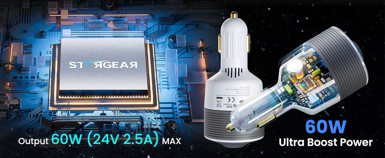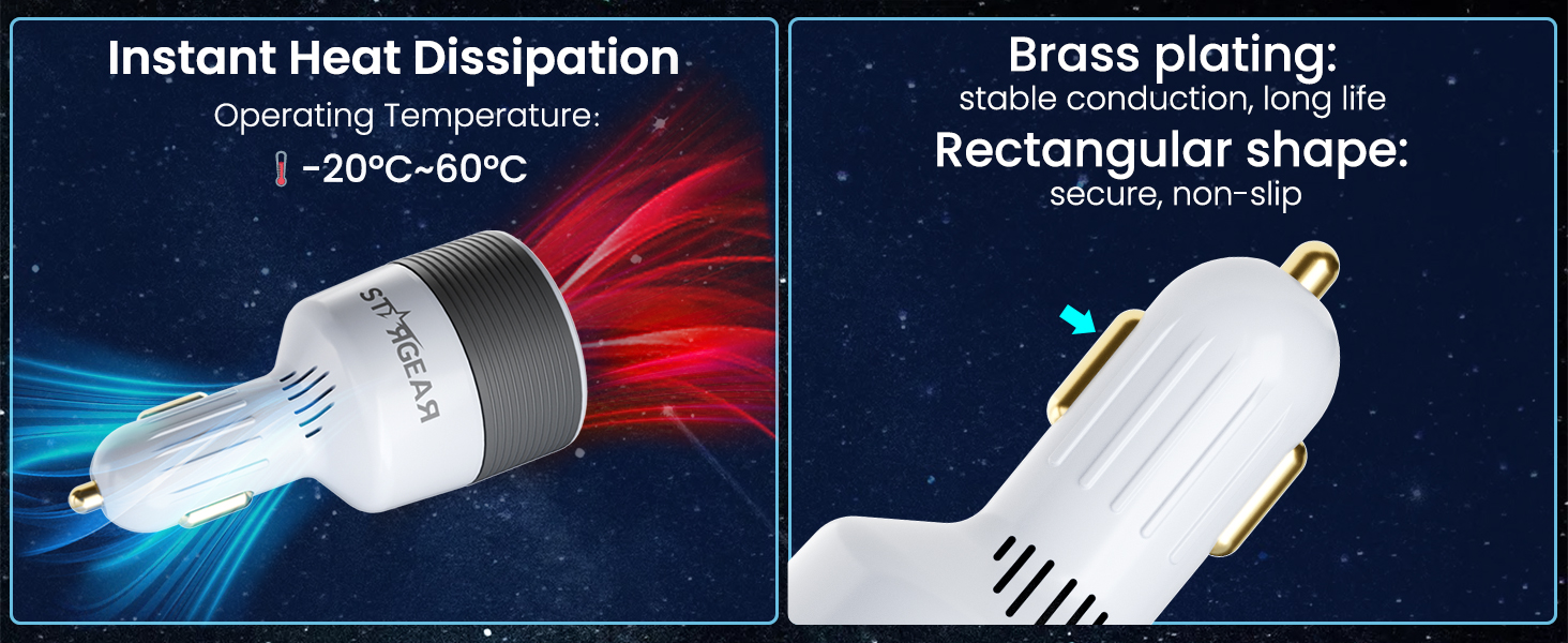 - [ Heat Dissipation & Gold-Plated Endurance ] Brass-plated pure copper cores deliver oxidation-free conductivity in your 12V car charger or cigarette lighter adapter. The car cigarette lighter plug locking design prevents disconnection in high vibration zones. Dual heat dissipation sustains full 24V/60W output—perfect Starlink Mini car adapterand 12V to 24V booster for RV power converters or DC to DC chargers
