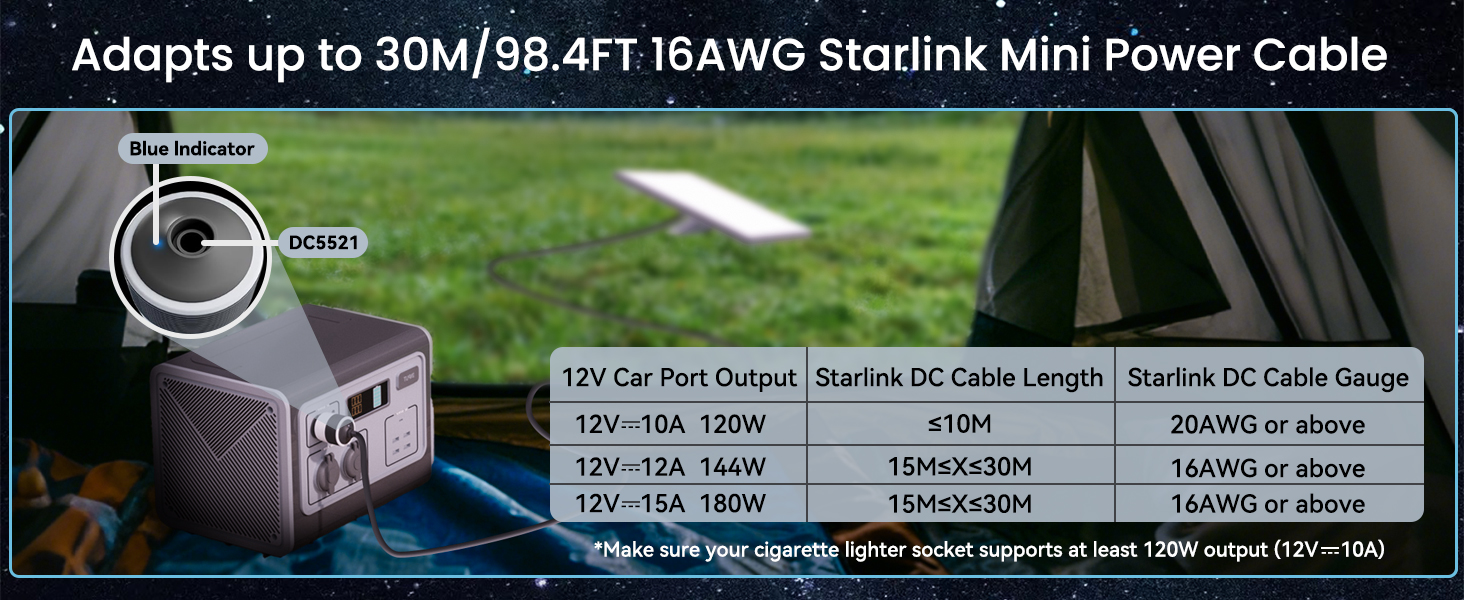 - [ Max 30M/98.4FT 16 AWG Official Cable Support ] Works with official 30M/98.4FT Starlink Mini cables using a 16 AWG power cord — Low voltage drop. This premium Starlink Mini power supply requires no tools; just ensure your cigarette lighter socket supports at least 144W output (12V/12A) before plugging into standard 12V cigarette lighter sockets to deliver 24V power, supporting uninterrupted off-grid adventures