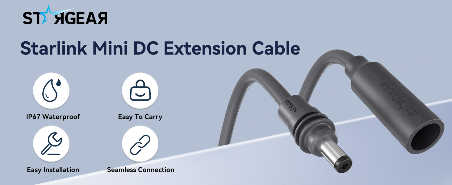 • 16AWG Thicker Starlink Mini Cable: This product includes 1*30CM starlink mini dc extension cord. STARGEAR starlink mini dc extension cable combining a strong 16AWG wire with thicker metal, being capable of handling up to 5A current, offers enhanced durability and ensures more consistent power delivery for your Starlink Mini while supporting customized installations