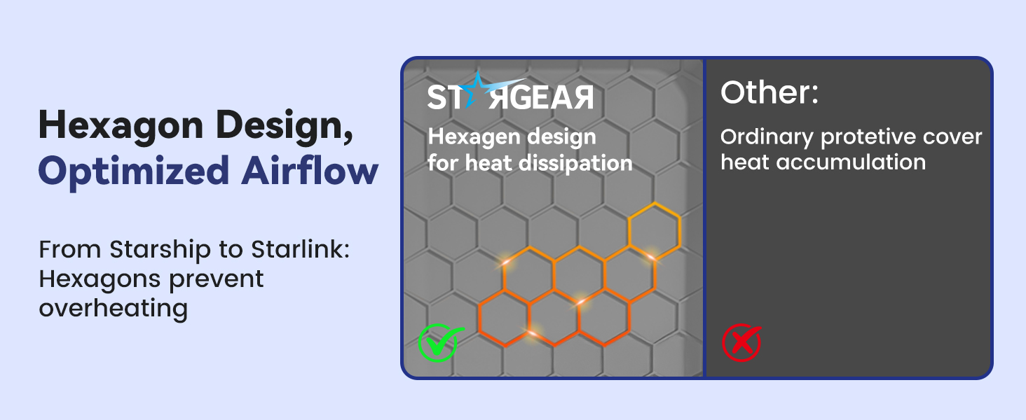 - [Sleek Meets Futuristic]Featuring a unique hexagonal texture inspired by spacecraft heat shields, the Starlink Mini Silicone Cover combines modern aesthetics with structural strength. The design disperses pressure, enhances stability, and stands out with a sleek, futuristic look—a tribute to interstellar exploration.
