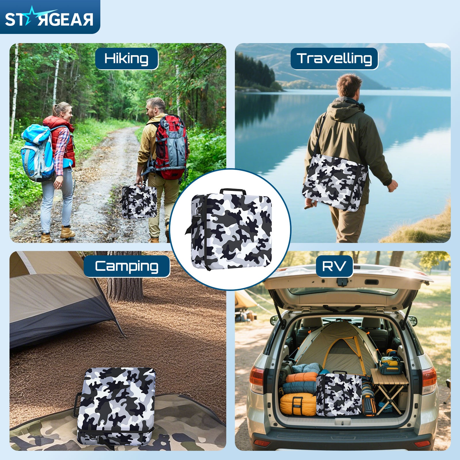 Featuring a camouflage exterior design, the bag not only blends into outdoor surroundings but also adds a touch of style, making it an ideal companion for rv, camping, hiking, or any outdoor adventure
